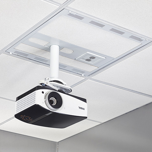 The CMS492CP2 conceals AV equipment above a 2' X 2' ceiling tile and supports a 1.5" NPT column drop for mounting projectors within the same tile grid providing a clean professional look for classrooms and conference rooms.Includes a high-performance, dual gang housing, isolated ground, dual receptacle outlet featuring the SurgeX® non-sacrificial multi-stage filtration and surge protection system. This protects equipment from disruptive high frequency noise and damage caused by power disturbances.Chief's powered solutions were co-developed with SurgeX, a brand of AMETEK® Electronic Systems Protection.Features- Optimal pipe flexibility within the tile helps with less reliance on image correction improving image quality- Drop carriage door improves accessibility and serviceability providing full access to equipment- Detachable power housing can be pre-installed with electricians on site and assembled to the storage box at a later time- Inside the plenum box or facing the room- Up to 2 single gang or 1 dual gang outlet- 4 nested knockouts for 1-1/4", 1", & ½" diameter conduit- Built in ventilation- AV tray supports a variety of AV components- Ships with 1 shelf, 2nd shelf sold separately see CMSUNV2- 1 RU rack rail brackets sold separately, see CMS1RU- Overall weight capacity 100 lbs (45 kg)- 50 lbs (22 kg) for projector ceiling plate- 25 lbs (11 kg) per shelf location- Ships with speed connect installation hardware- Lightweight construction, one man installation- Plenum rated, UL approved in accordance to 2043- TAA Compliant- Surge and Filter Module- Non-volatile spike protection with LED power indicator- Non-sacrificial multi-stage technology- Non-current limiting design passes full power on a regular circuit; redundant protection circuits- Improves the reliability and functionality of connected equipment by safeguarding equipment from high energy transients, lightning strikes and electronic noise events that can cause gear degradation and downtime- Line filter reduces common and differential mode noise by up to 40 dB - Rated for 125V~, 60Hz, 15 A- 1875 watt maximum- Ferrite toroid based EMI Filter- Withstand rating of 240 VAC continuous without damage or loss of protection